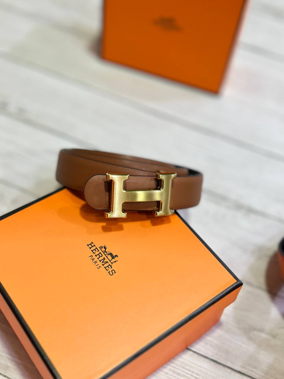 کمربند زنانه هرمس قهوهای ۲.۵ سانتیمتری با سگک طلایی لوگوی H انتخابی لوکس برای استایلی بینقص