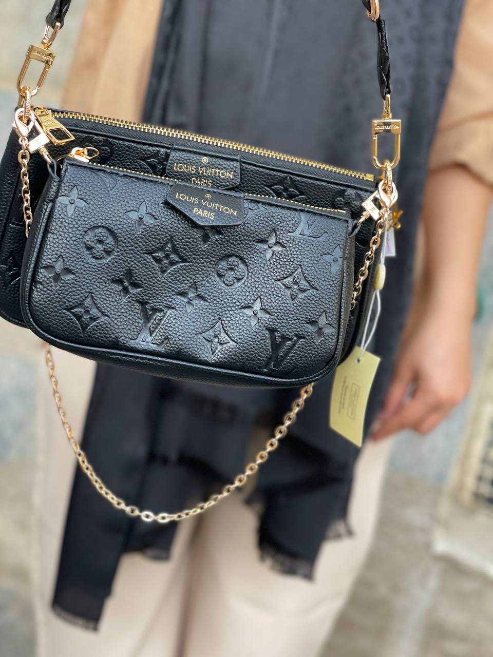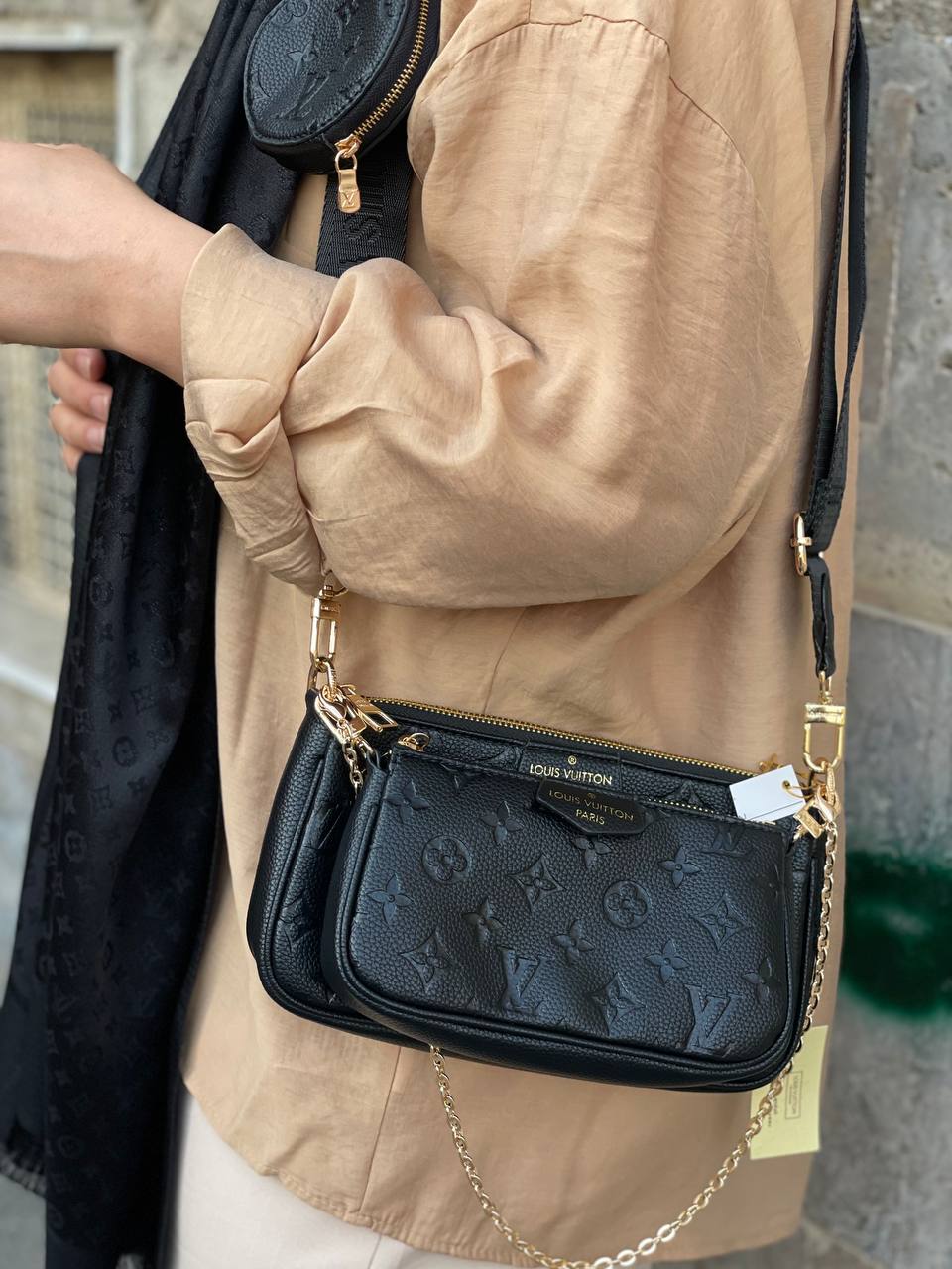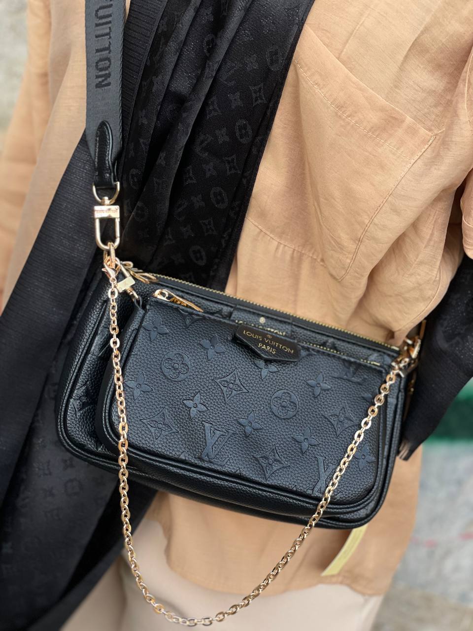 با کیف زنانه Louis Vuitton سهتیکه مشکی استایل خود را به سطحی بالاتر ببرید. این کیف با طراحی مدرن و چندکاره شامل بند دوشی پهن برای راحتی بیشتر بند دستی و زنجیر طلایی شیک است که جلوهای لوکس به تیپ شما میبخشد.